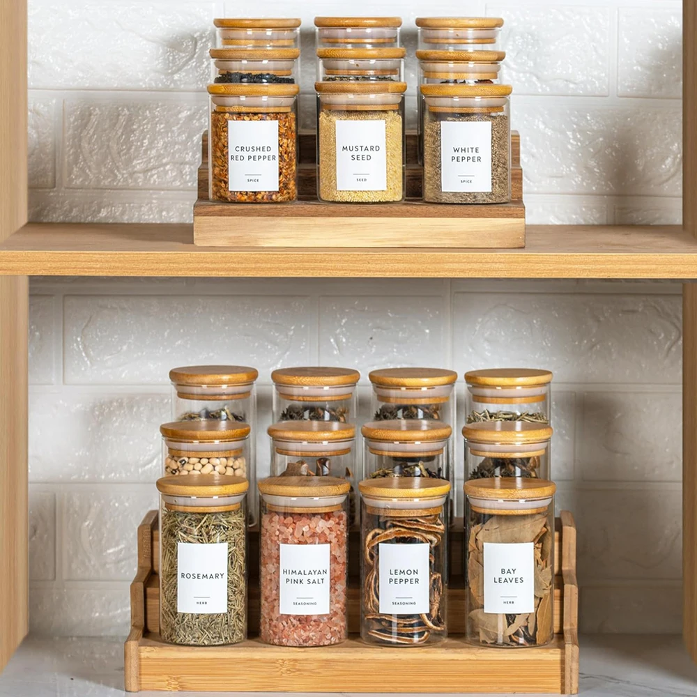 Glass Spice Jars with Bamboo Lids - Airtight Seasoning Containers with Spice labels Preprinted - Small herb Jars for Pantry Organization and Storage