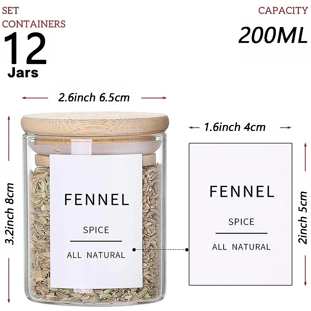 12Pcs Glass Spice Jars with Bamboo Airtight Lids 6.5oz Small Food Storage Containers for Kitchen, Seasoning, Coffee, Herb