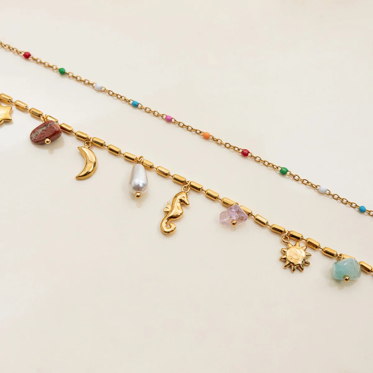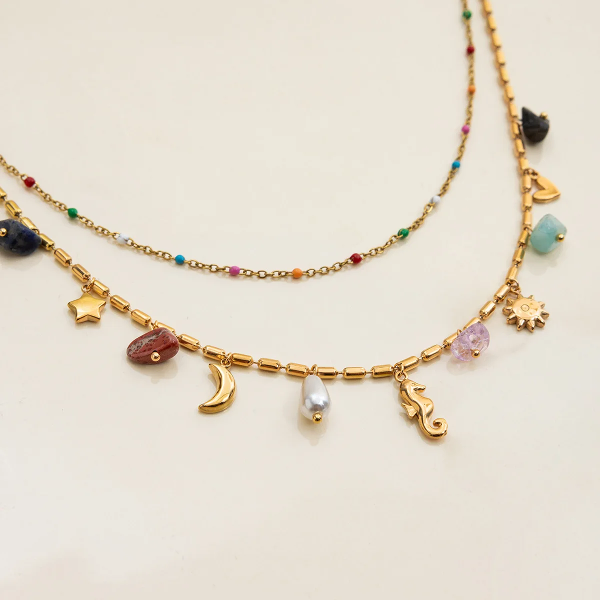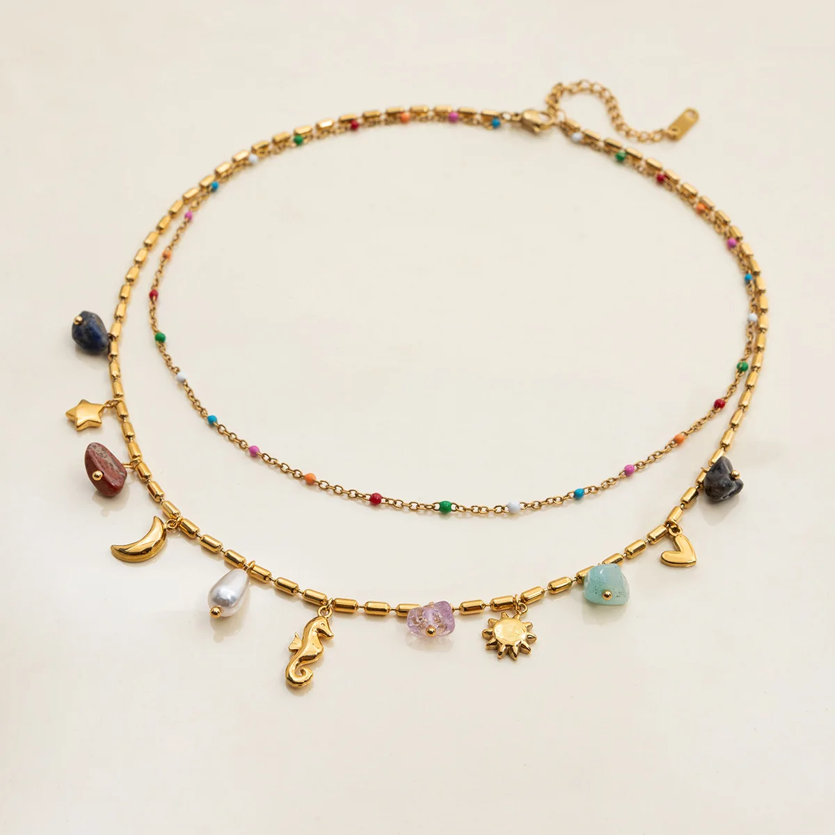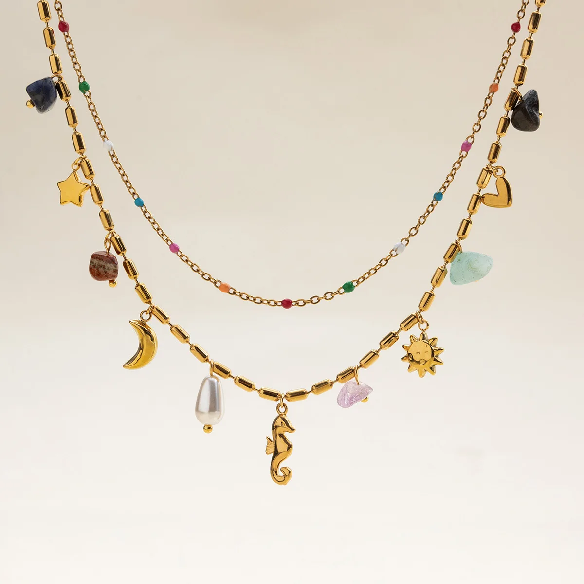 Boho Irregular Natural Stone Rhinestone Faux Pearl Sea Horse Star Moon Pendant Necklaces for Women Double Layers Choker Jewelry