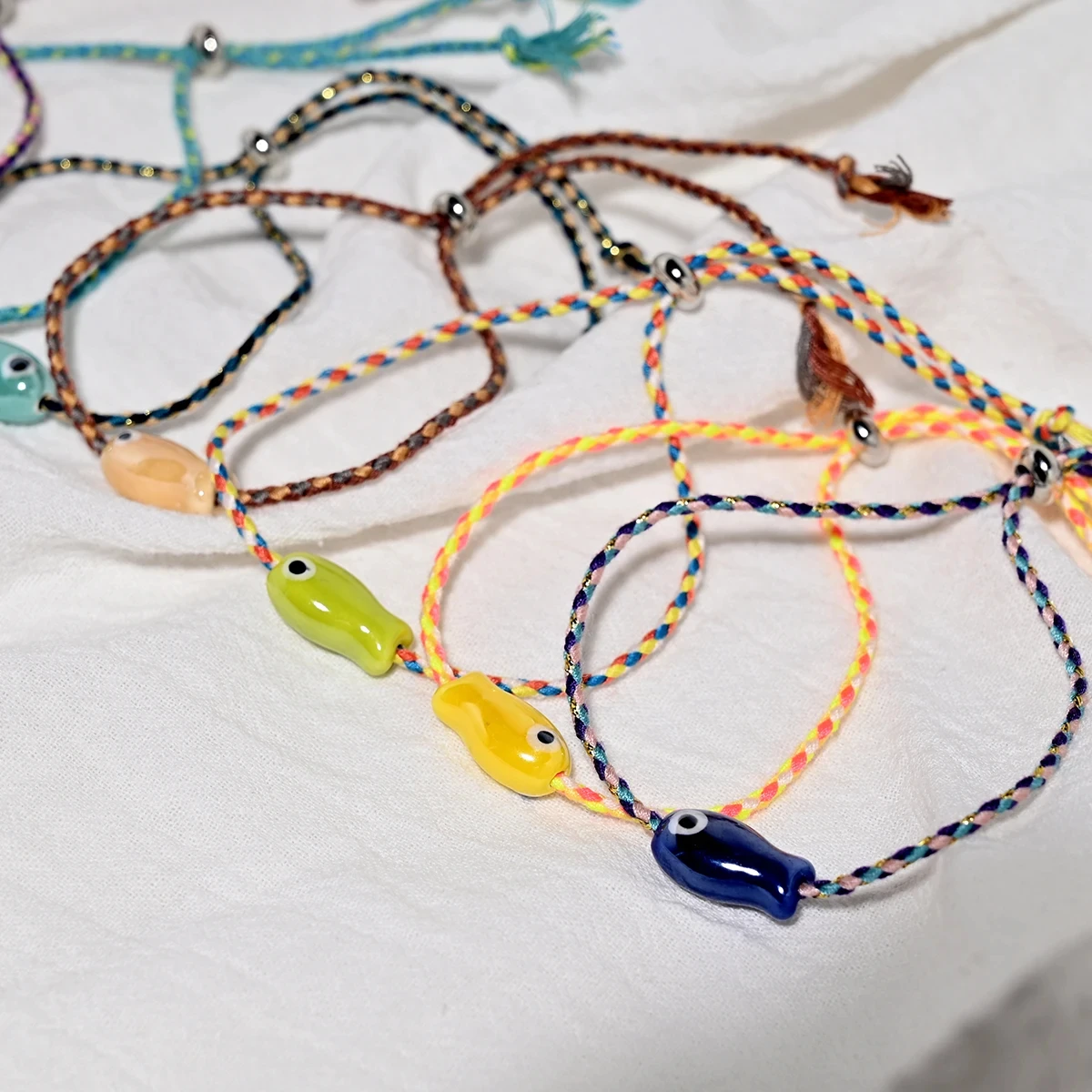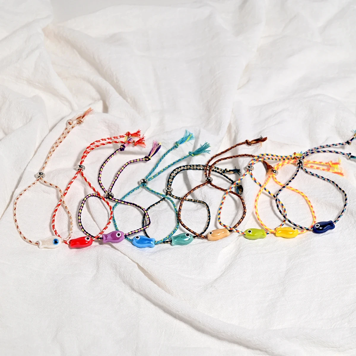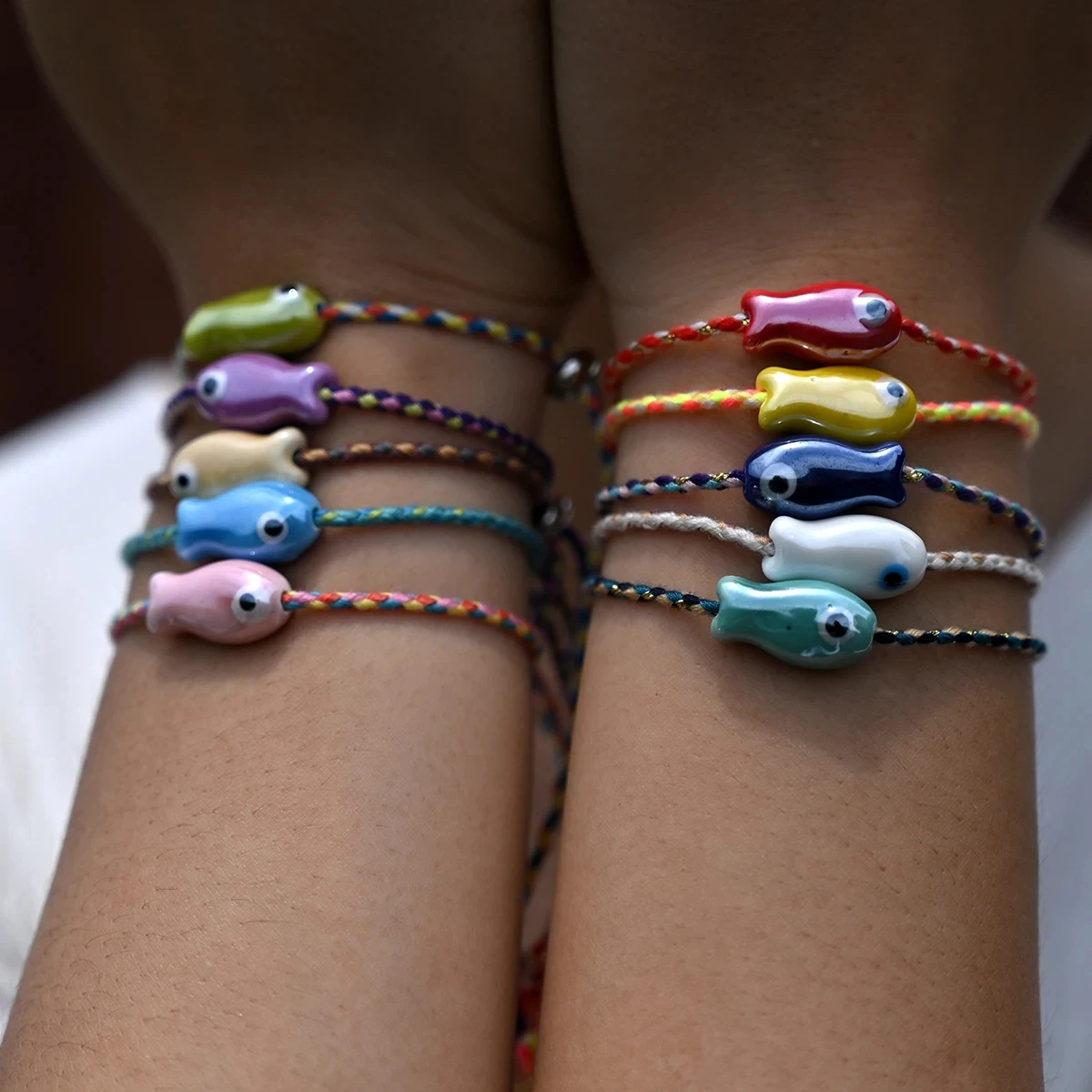 Set of 10Pcs Ceramic Fish Bracelet for Women Handmade Woven Colored Rope Boho Wrap Charm Bracelet Friendship Popular Jewelry