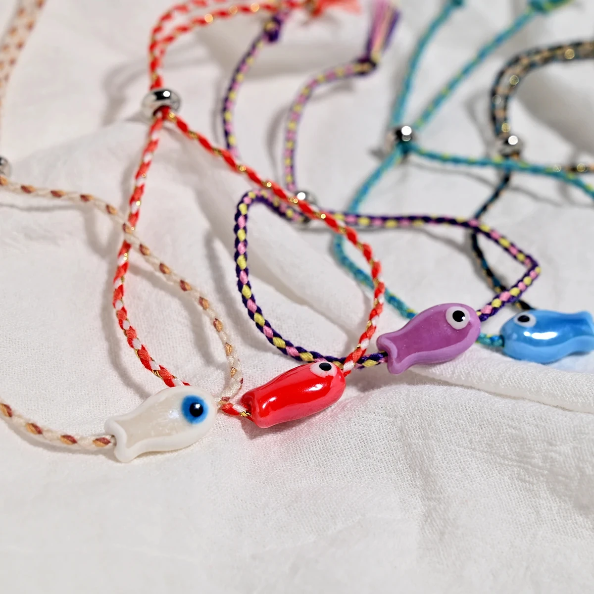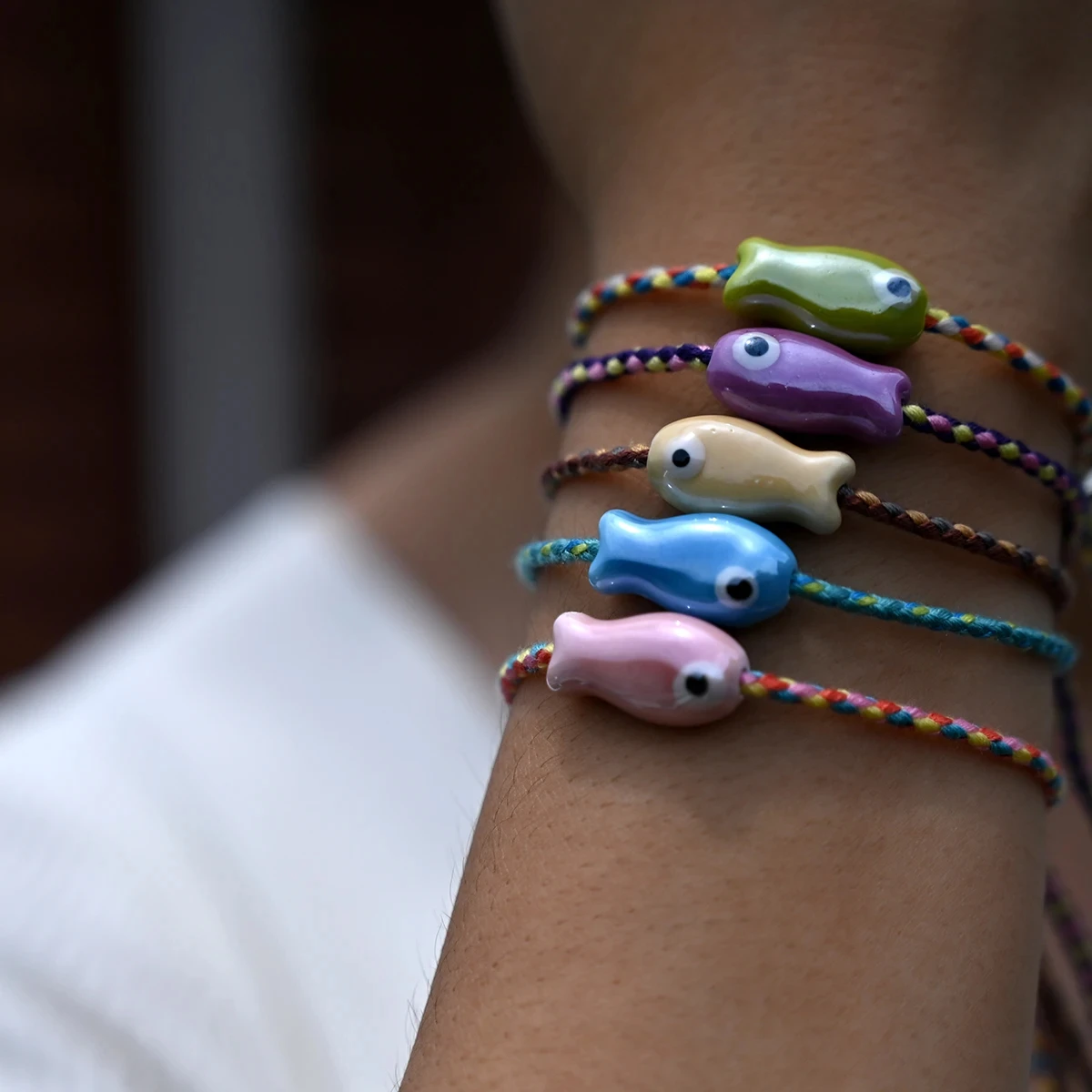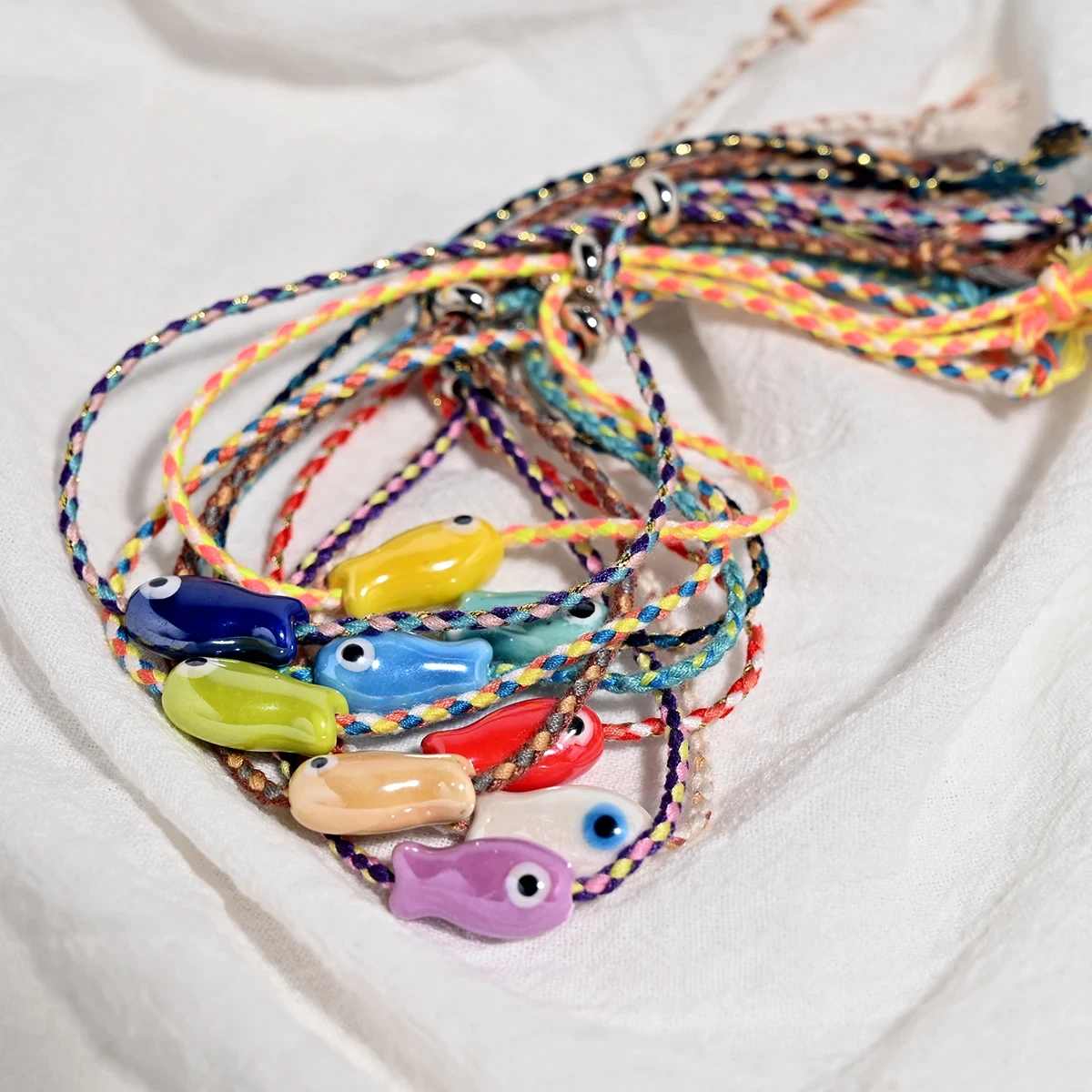Set of 10Pcs Ceramic Fish Bracelet for Women Handmade Woven Colored Rope Boho Wrap Charm Bracelet Friendship Popular Jewelry